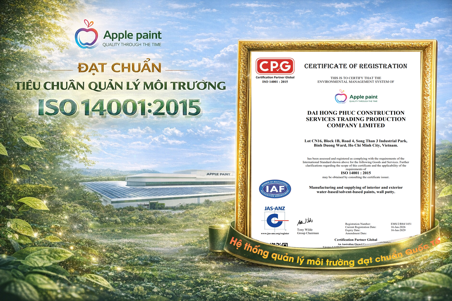 Trong ngành sơn, những yếu tố hóa học luôn đi kèm rủi ro môi trường và sức khỏe, vậy nên "Xanh" là một hệ tiêu chuẩn được kiểm chứng, đo lường và vận hành từ gốc. Với Apple Paint và Công ty TNHH SX TM DV Đại Hồng Phúc, định hướng này được thể hiện rõ ràng thông qua ba trụ cột: Nhà máy đạt chuẩn chứng chỉ LEED Hoa Kì, hệ thống quản lý môi trường ISO 1400 và sản phẩm đạt chứng nhận Green Lable Quốc Tế.